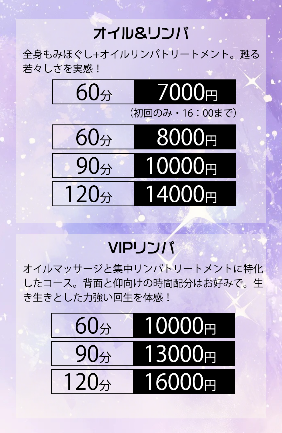 | NEW OPEN!!!2026/02/05 当店では、アロマオイルの効能と当店自慢のセラピストによるリンパマッサージの相乗効果による、癒しのひとときをお客様お一人お一人にお届けしております、自然で心やすらぐ優美な香りを、施術中はもちろんご帰宅お休みになってから翌日朝目覚めでまで楽しんで頂けます、どうぞゆっくりご堪能ください。 |